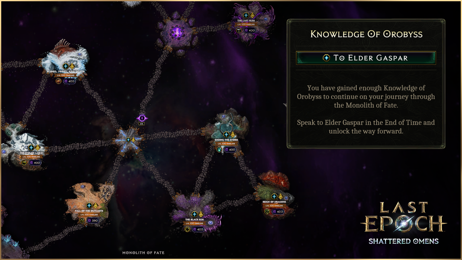 To access the last three Timelines, you must seek the Knowledge of Orobyss. You must gather five Knowledge points to unlock the level 90+ Timelines. To gather Knowledge, you must complete the final two chapters of the current campaign and/or conquer any of the first seven Timelines. Completing Timelines or the final two chapters rewards you with one Knowledge. The level 80+ Timelines will reward you with two, meaning you can reach the Empowered Timelines faster by taking a more challenging approach.