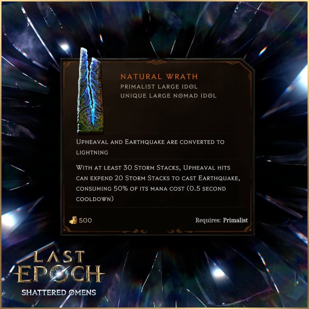 For those Primalists that just want to stomp and smash things, we encourage you to check out Natural Wrath. This adds a new lightning conversion to Upheaval, and also allows you to convert Earthquake to lightning without turning it into a spell. And yes, when it expends Storm Stacks to cast Earthquake, that means you get 20 casts of Storm Bolt hitting enemies instantly.