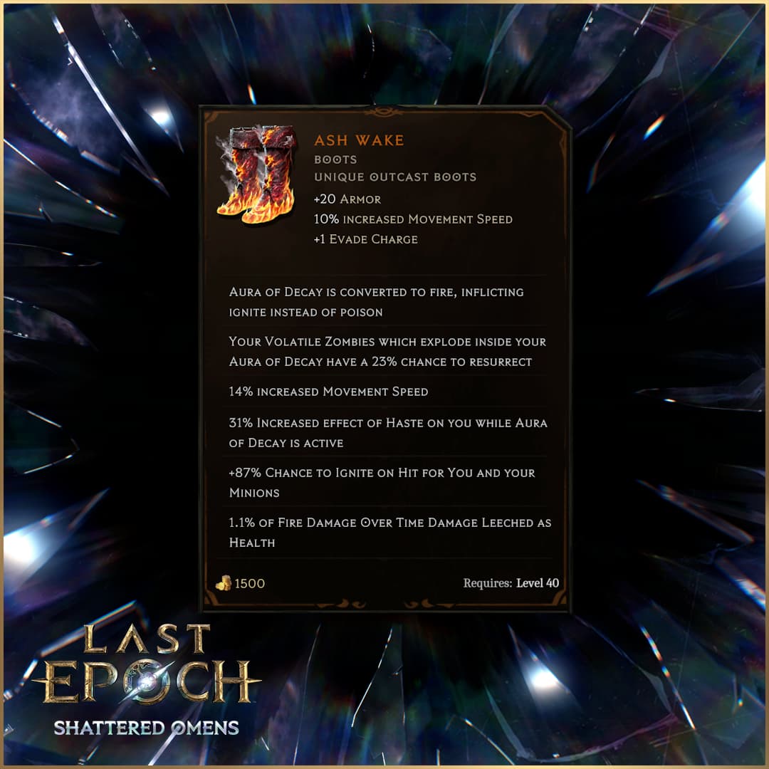 For the volatile zombie enjoyers, we’ve got some new boots for you. Ash Wake converts Aura of Decay to fire, allowing you to inflict ignite instead of poison. Any of your volatile zombies that explode inside your Aura of Decay have a chance to resurrect.