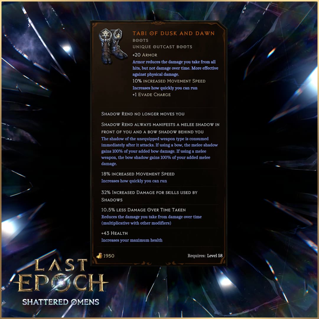 For Rogue players who want more kicks out of their shadows, say hello to Tabi of Dusk and Dawn. These unique boots alter Shadow Rend to remove the movement given by the skill in exchange for a melee and bow shadow to be created.