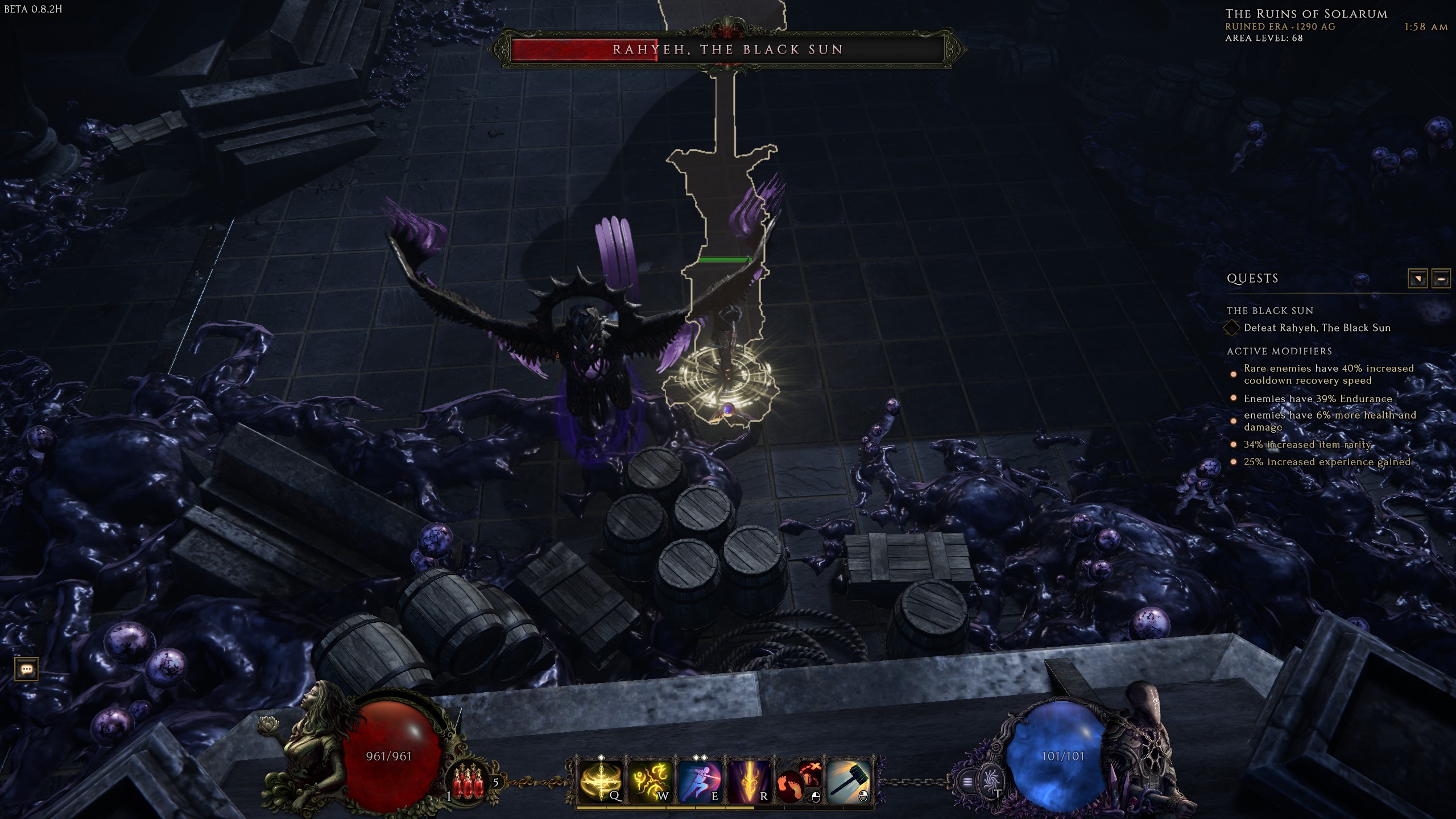 When I was fighting Rahyeh, The Black Sun, in the Ruins of Solarum (Black Sun Timeline), it did it’s line attack, but instead of coming back to the area, it decided to fly all the way to the entrance of the area. From there it appeared to be stuck on some barrels, no matter where I stood it wouldn’t engage me. I was able to kill Rahyeh, without it engaging me at all.