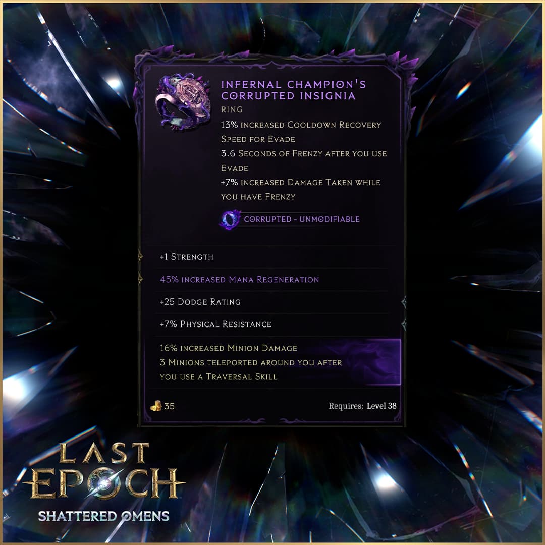 With Rings, you may come across Corrupted Insignia. This gives you increased cooldown recovery speed for evade and grants frenzy when you evade, in exchange for increasing your damage taken while you have frenzy. Deadstar, a subtype for Amulets, will reduce your armor, but grant you less damage over time taken and increase your damage over time.