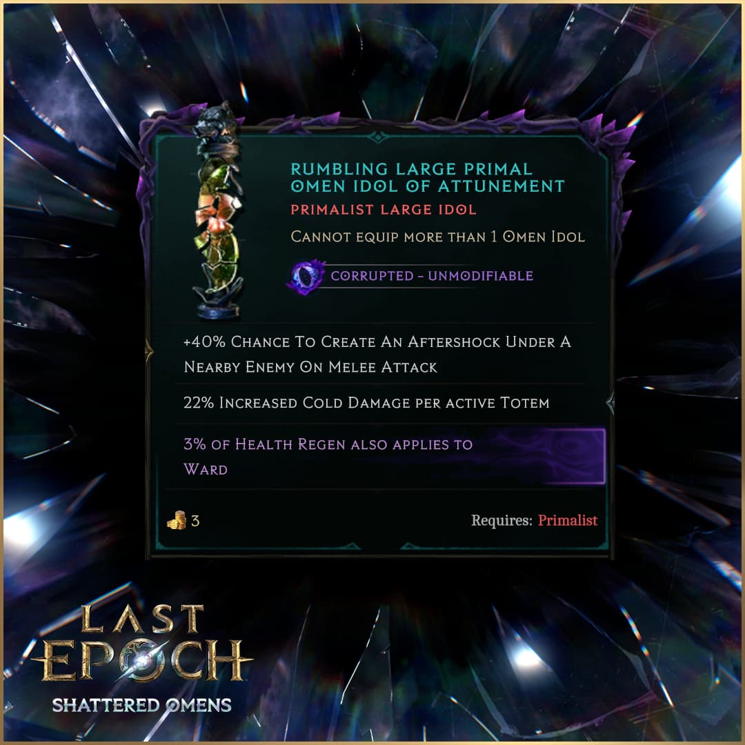 Omen Idols are a new type of of 3x1 or 1x3 Idol that drop from Omen Window encounters and are always corrupted. These are more powerful than standard idols of their size, with prefixes and suffixes of the same power as 1x4 or 4x1 Idols, and the potential to roll with modifiers otherwise only available on 1x4, 4x1, or 2x2 Idols.