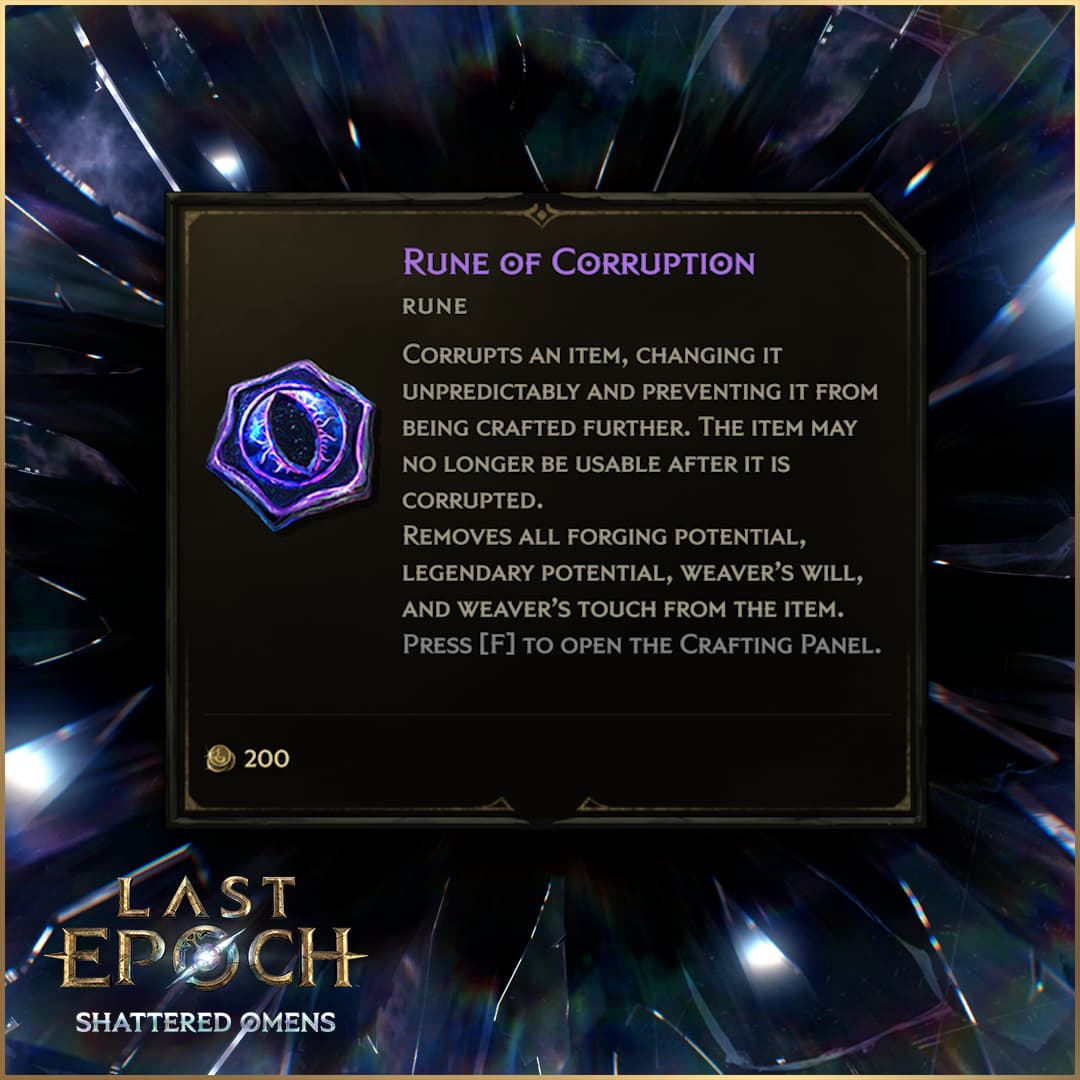 After successfully defeating the Omen, you will find the all-new Rune of Corruption among your loot. When forging an item with a Rune of Corruption, it can either make the item better or worse than before. Some examples of making the item better can include adding new effects and stats or maximizing the values of some or all rolls of the item. And when the item has become worse, its roll values could be minimized, it could lose affix tiers or turn to a random magic item. Make sure to craft your items to their full potential before corrupting them, as corrupting them makes them unmodifiable!