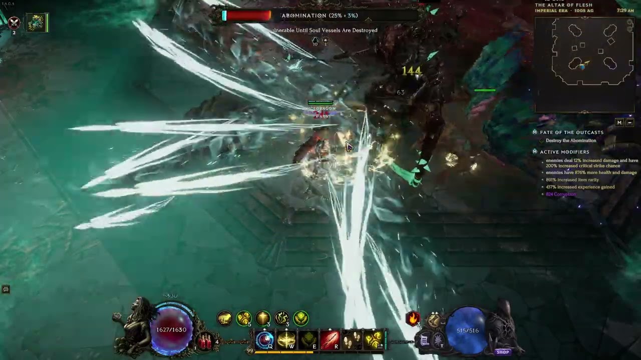 something I noticed immediately in the fight is you need to play at weird angles. most builds just circle strafe him in a corner and pull him around hte edges, this does not work for us because we need him to be looking at us, so when he is charging around we lose damage uptime. And being directly in from of him is… dangerous to say the least.